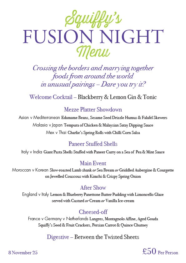Join us at Squiffy’s for an evening where borders blur and flavours collide. Fusion Night brings together bold tastes from around the world in playful, unexpected pairings that surprise your senses. Enjoy a welcome cocktail before diving into dishes that mix Asia with the Mediterranean, Italy with India, and Morocco with Korea. Each course is designed to challenge tradition and celebrate creativity. It’s a dining experience built for adventurous food lovers who enjoy something different on their plate.